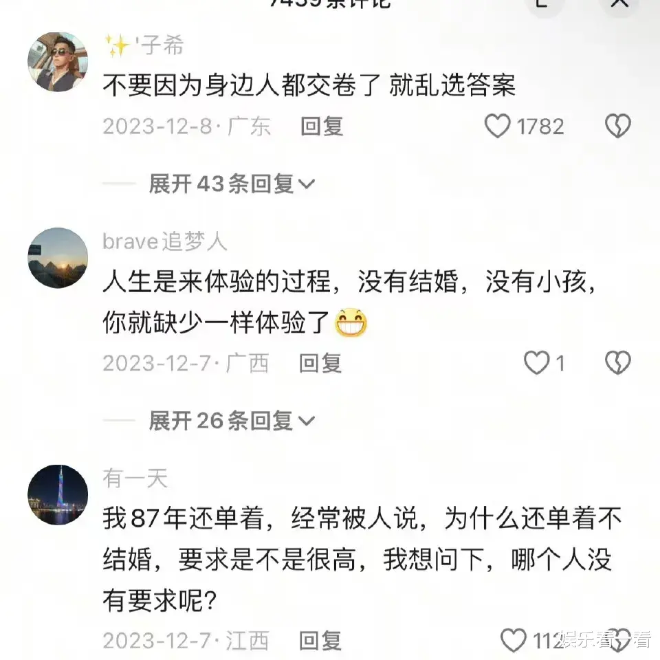 许多网友表示尊重她的决定,并希望她能找到真正的幸福,认为结婚并不是衡量一个人是否幸福的唯一标准,真正重要的是能够找到一种适合自己的生活方式,让自己的内心感到满足和平静。