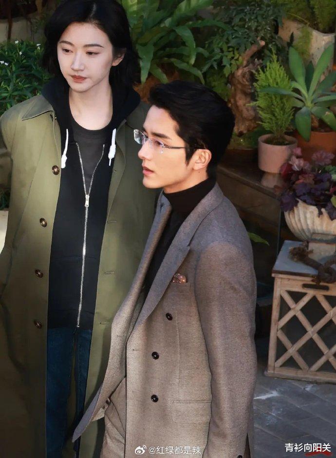两人同框的时候,小风吹过,景甜的短发微微飞起,墨绿色的风衣外套,内搭休闲。