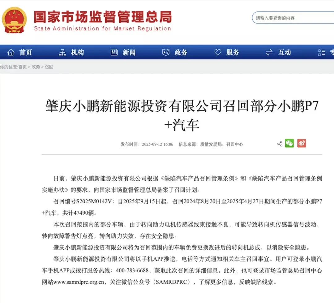 9月15日起,小鹏汽车将召回2024年8月20日至2025年4月27日期间生产的部分小鹏P7+汽车,共计47490辆。