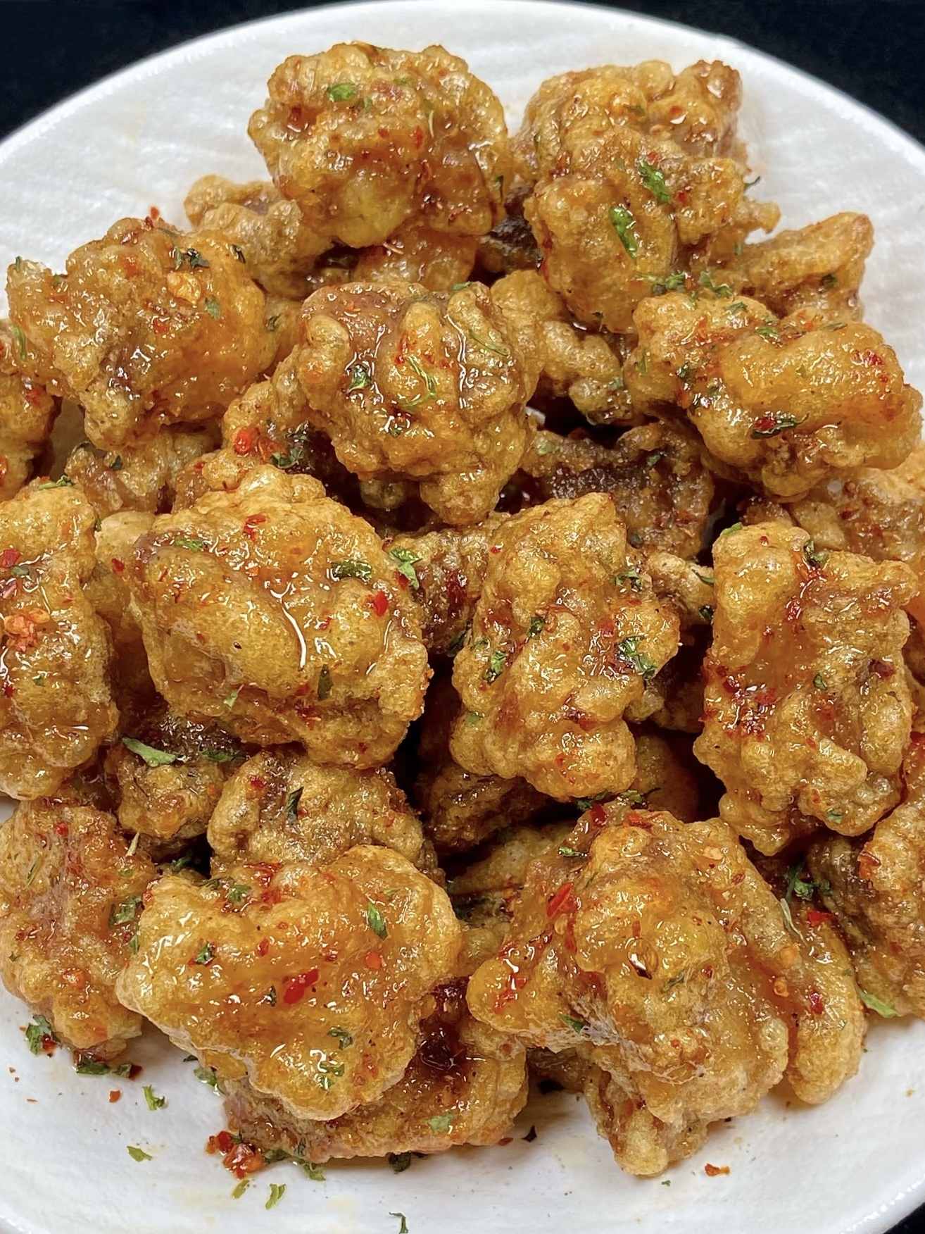 1. 蒜香版——炸肉后留底油,爆香蒜末+小米辣,回锅翻两下,蒜香+椒香双重暴击。