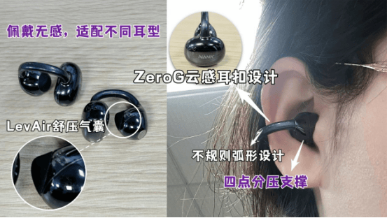 ●佩戴体验:南卡Clip Super2在设计上全面升级。耳机固定单元配备LevAir零压气囊,会根据耳朵受力自动调节,戴着几乎感受不到负担。整机重量仅4.8克,即便长时间佩戴也轻若无物。ZeroG云感耳扣搭配不对称弧形四点支撑,既稳固又舒适,跑步或轻运动时也不容易滑落。连接桥采用航空钛合金和高分子记忆材料双层复合结构,兼具柔韧性和强度,经实测弯折一万次依旧完好。稳、轻、韧三方面都兼顾,佩戴体验非常出色!