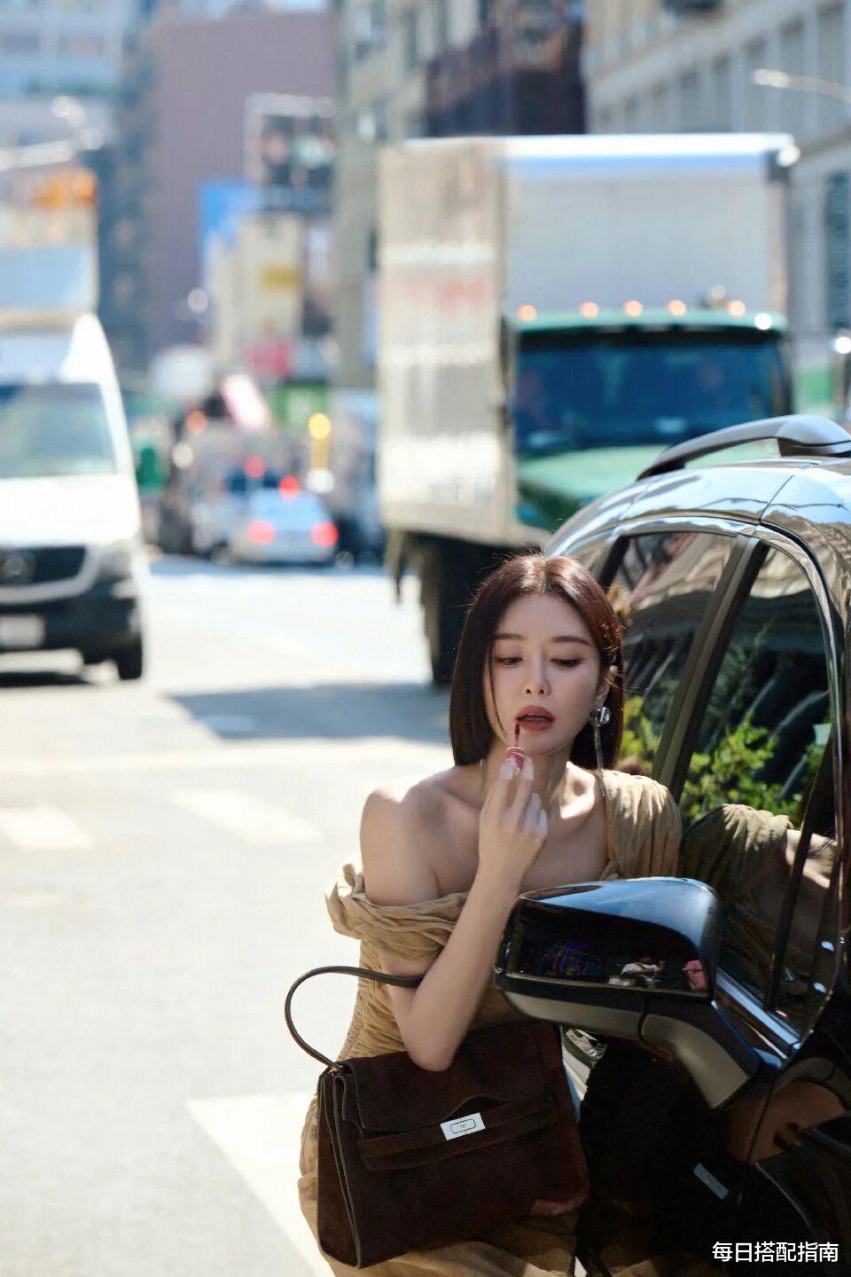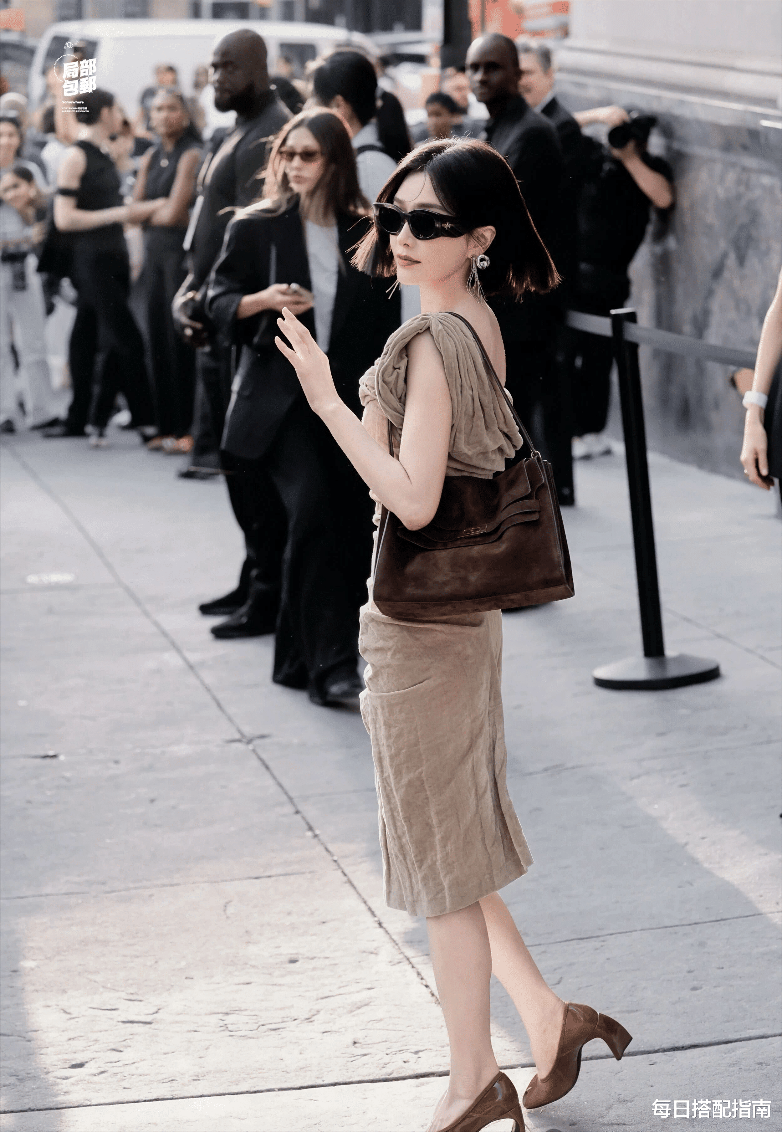 米色褶皱连衣裙紧贴身形,肩颈处做了雕塑感的堆叠与微露,脚下是同色系的高跟鞋,肩头挎一只深棕麂皮大包,利落短发与墨镜一戴,整个人在阳光里呈现出一种不言自明的高雅。第一眼的感觉不是张扬,而是“克制的精致”——松弛、干净,却处处有线条。✨