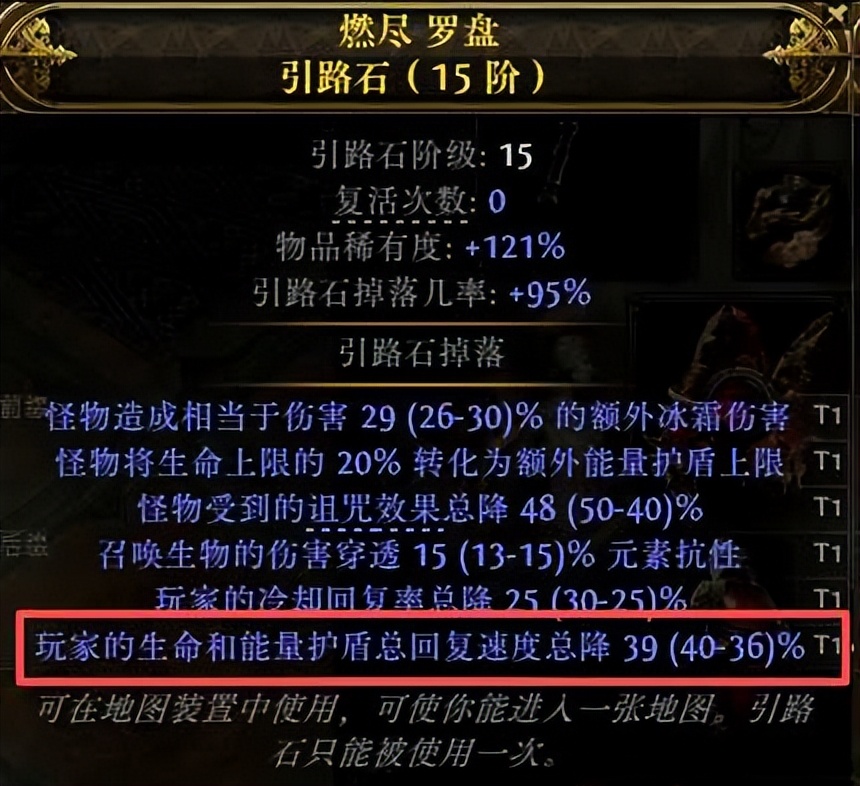 上一篇文章给大家带来了冰血法的BD分享,这篇给大家带一个冰血法的补充教学,如何用猴戏让伤害更大化!众所周知血法需要靠 耗血➡吸血➡回血 来组成永动底层逻辑,而GGG为了扼制血法的后期过于强大的刷图能力,就在地图(引路石)词缀中加入了一条生命/护盾总回复速度总降40%左右的词条(如下图)。这个词条极大的影响了血法师的永动机制导致偶尔会因为这个词条暴毙。接下来我们的升级版就将通过天赋、技能、装备、涂油来完美我们的冰血法。