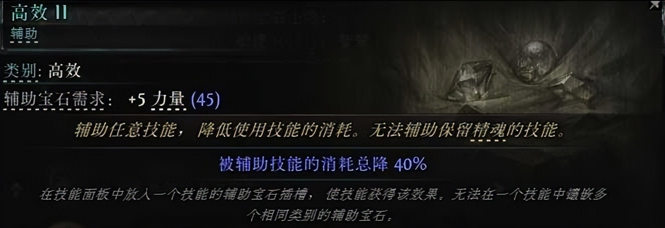 为了应对满词T15/16高概率遇到此词条的问题我们也需要降低自身消耗,所以我们找到了 辅助技能石:高效Ⅱ。
