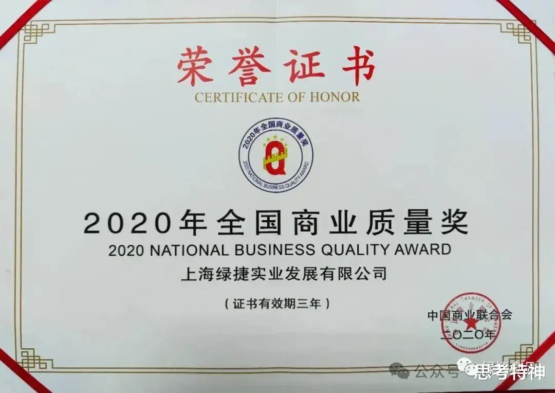 2020年11月1日,由中国商业联合会主办的“2020年全国商业科技质量大会”在北京隆重召开,上海绿捷是上海市唯一一家餐饮服务企业获评“2020年全国商业科技质量奖”获奖单位。