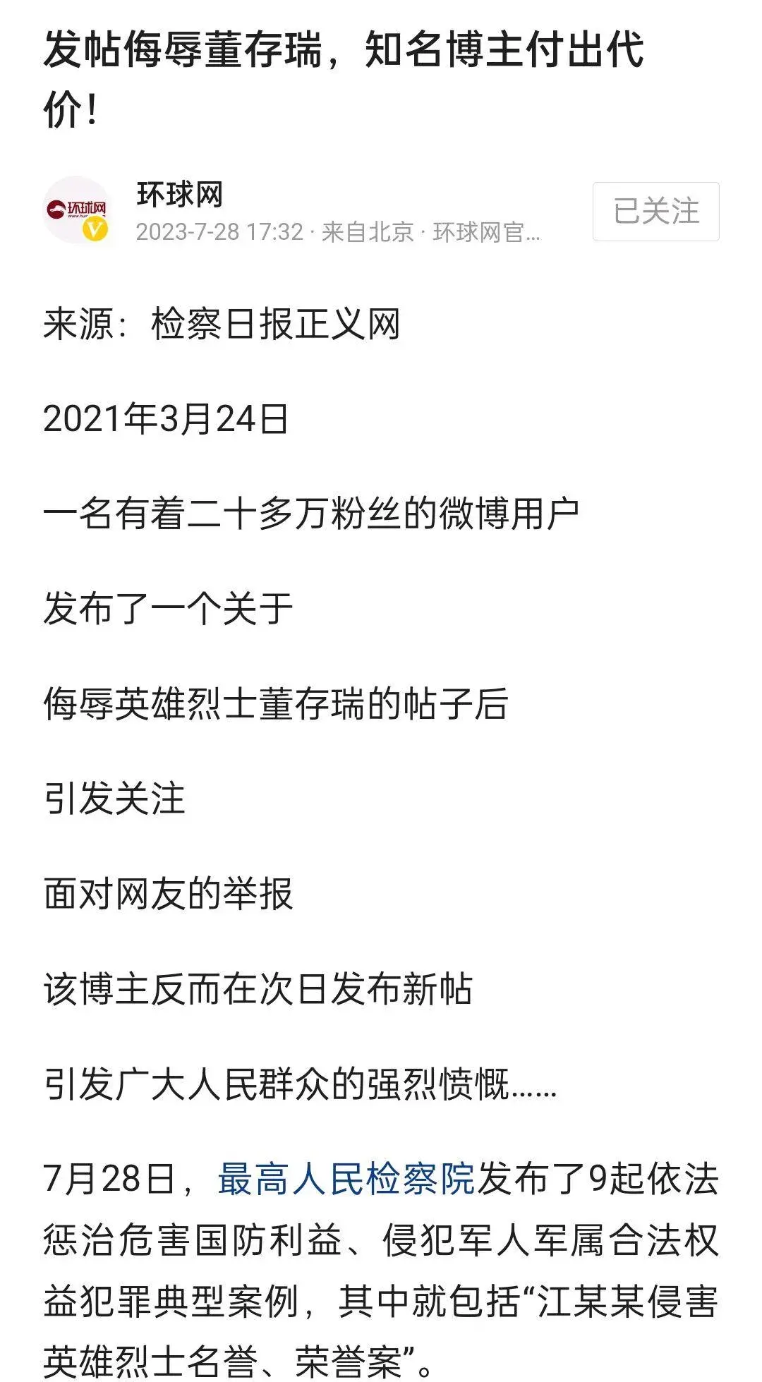 尘埃落定!发帖侮辱董存瑞,知名博主付出代价!传播正能量……