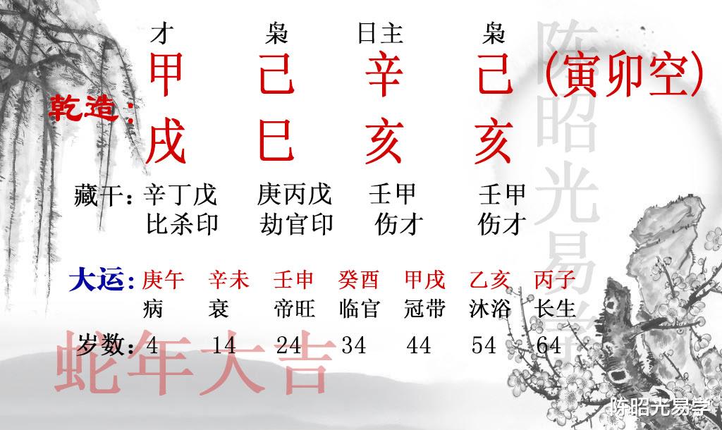 乾造:甲戌,己巳,辛亥,己亥(寅卯空)