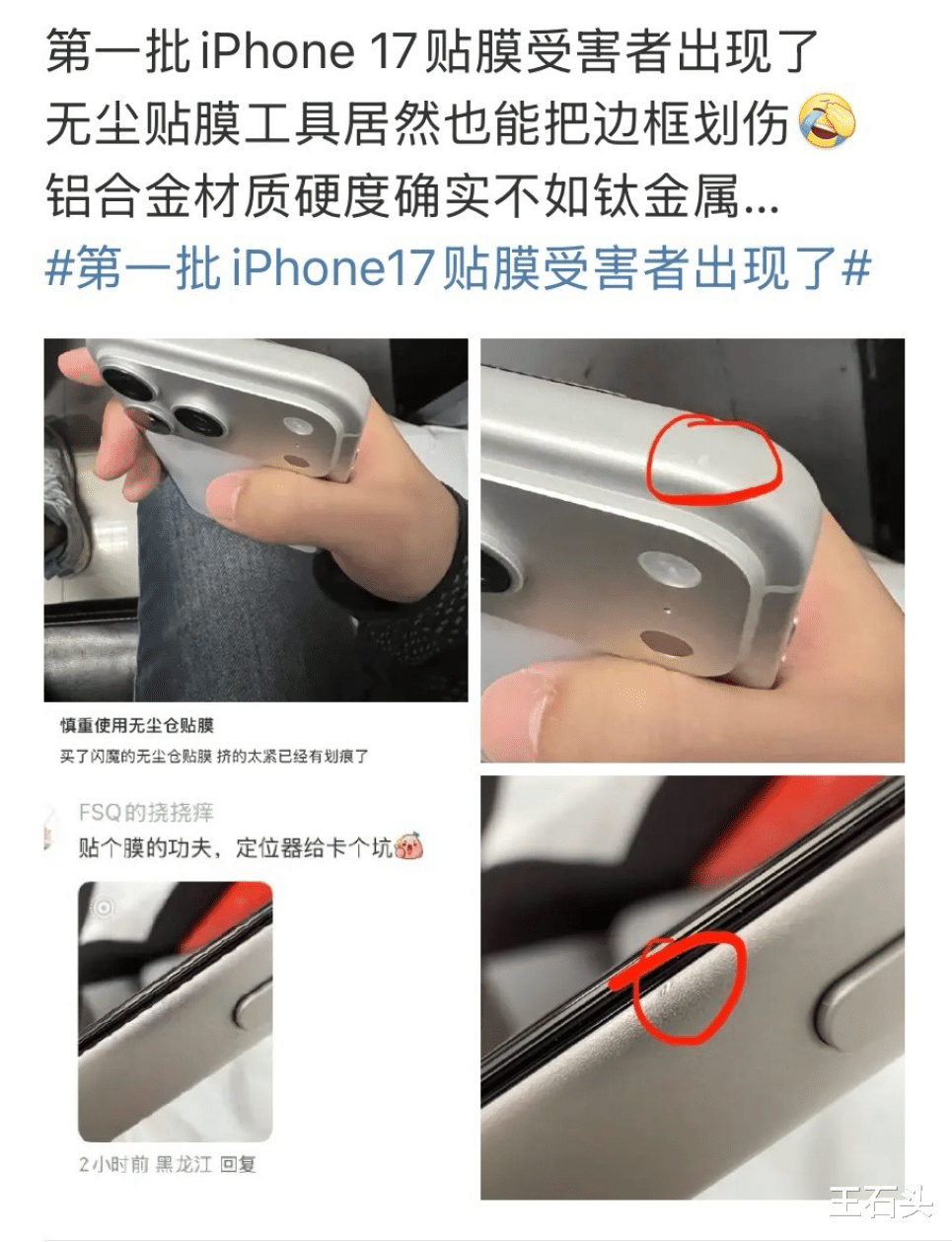 一位网友称,仅使用无尘贴膜工具的定位框轻轻触碰iPhone 17 Pro的边框,就会留下明显的划痕。
