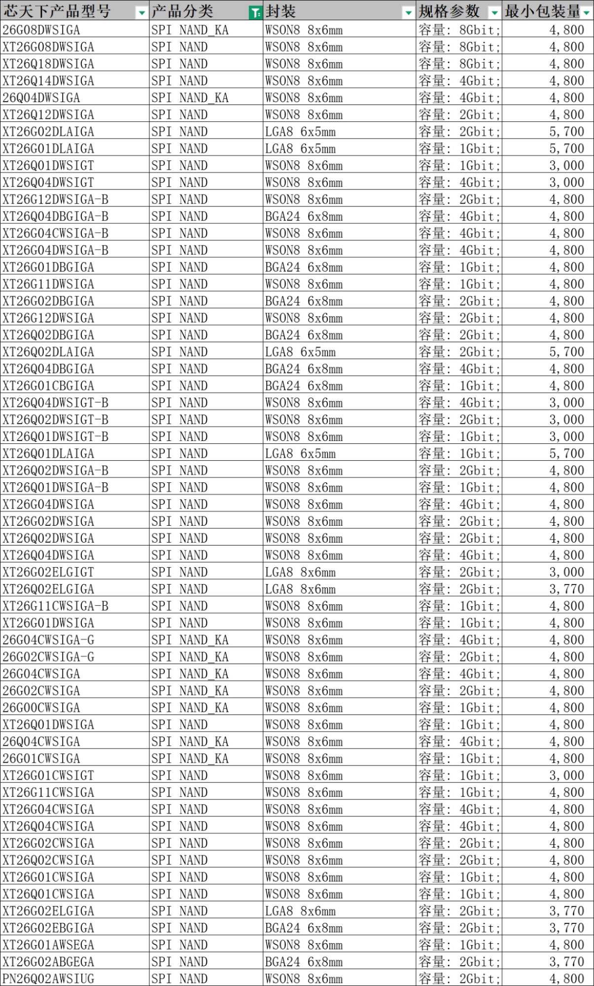 作为国产领先的存储芯片厂商,芯天下(XTX)在SPI NAND领域持续深耕,其产品覆盖1Gb至8Gb多种容量,广泛满足各类应用需求:
