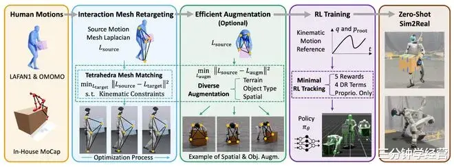 它的特殊之处在于,将人类动作"翻译"成机器人能理解的运动指令时,不再像传统方法那样生硬地套用轨迹,而是通过交互网格技术保留了人与物体、环境之间的微妙关系。