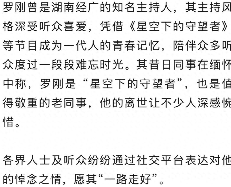 10月13日,记者从相关渠道获悉,湖南经广原知名主持人罗刚于2025年10月10日22时58分因突发心脏病不幸离世,享年53岁。