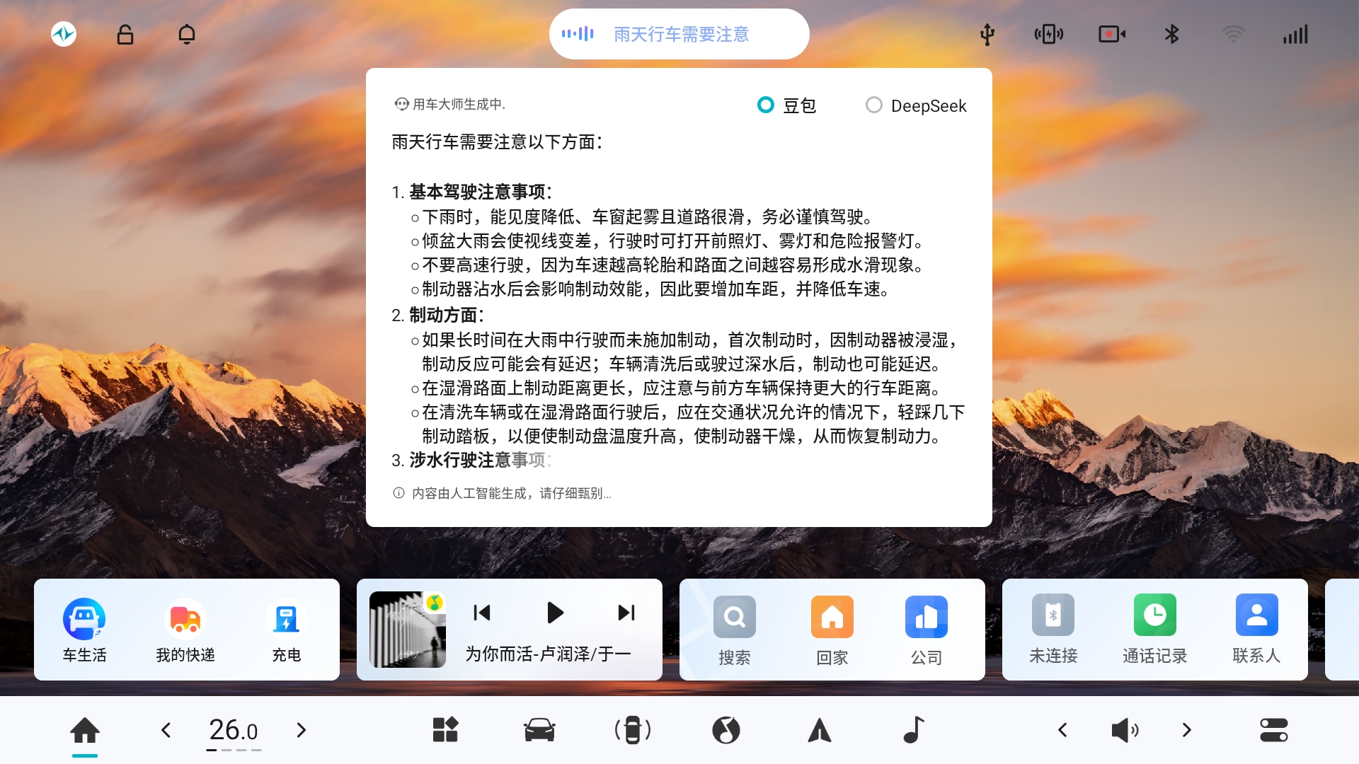 在交互层面,车机系统接入行业领先的豆包与DeepSeek双AI语音大模型,双剑合璧大幅提升了智能闲聊能力,无论是生活百科、新闻时事、交规查询,还是模糊搜索和互动游戏,都能轻松应对,对话更自然流畅,满足用户日常所需。