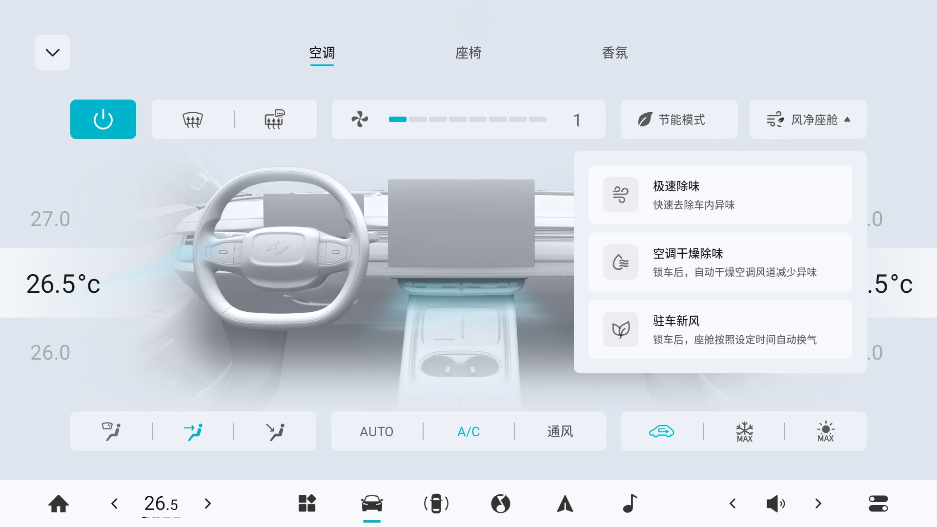 此次升级,全系车型还升级风净座舱2.0功能,通过四大模式打造健康舒适的车内空间。“极速去味”可在车内突发重度异味时,进行30秒换气,保持车内清洁;“驻车新风”可在预设时间自动换气,告别开门异味;“空调干燥除味”可在每次使用空调后自动烘干蒸发器和风道,避免异味产生;“高温抑菌”则通过开启空调高温内循环,降低病菌传播风险,守护家人健康。
