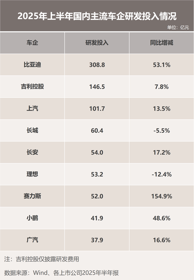 研发投入的“恐怖”数据对于比亚迪而言,研发投入高于净利润已经是常态。在2011年-2024年的14年间,比亚迪有13年的研发投入超过当年的净利润,截至目前累计研发投入超2100亿元。在2025年这个趋势依旧没有改变。2025年上半年309亿研发费,同比增长53%,比同期净利润高一倍,相当于吉利+长城+理想+小鹏四家总和;继2024年以542亿首夺A股“研发之王”,2025年上半年依旧稳居榜首。