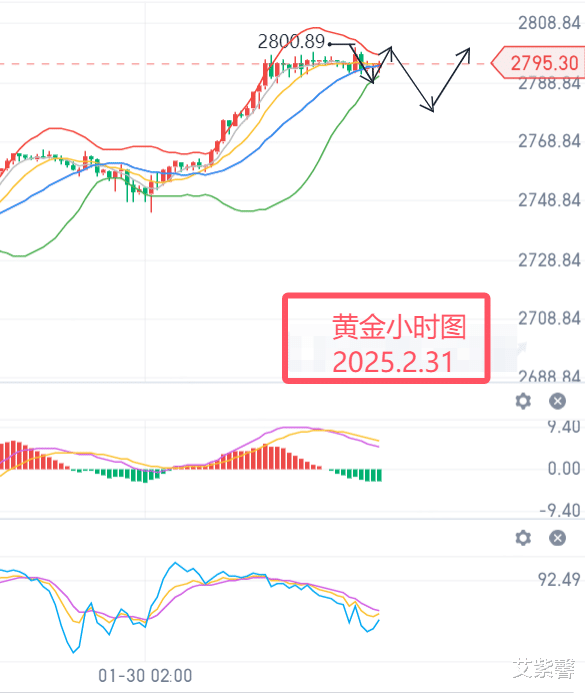 现货黄金(伦敦金):技术面上来看昨日日线收了一根中阳柱,布林带开口,KDJ指标形成金叉,目前来看大趋势偏上,中线阶段性上行。4小时图中来看,布林大开口,KDJ指标金叉放量欲拐角形成死叉。小时图中来看,布林带缩口 ,价格即将选择新的方向,KDJ指标死叉放量。价格如期回调修整后上行为主,短线预计依旧回调修整后上行为主,下方支撑关注2786/2771/2746一线,上方压力关注2800/2811/2824一线。