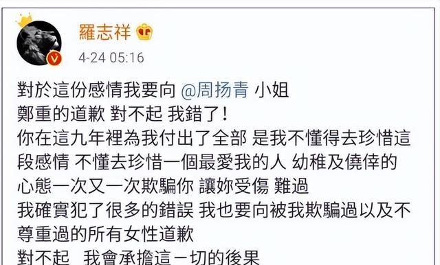 2020年4月,罗志祥的前女友周扬青在社交平台上爆料。