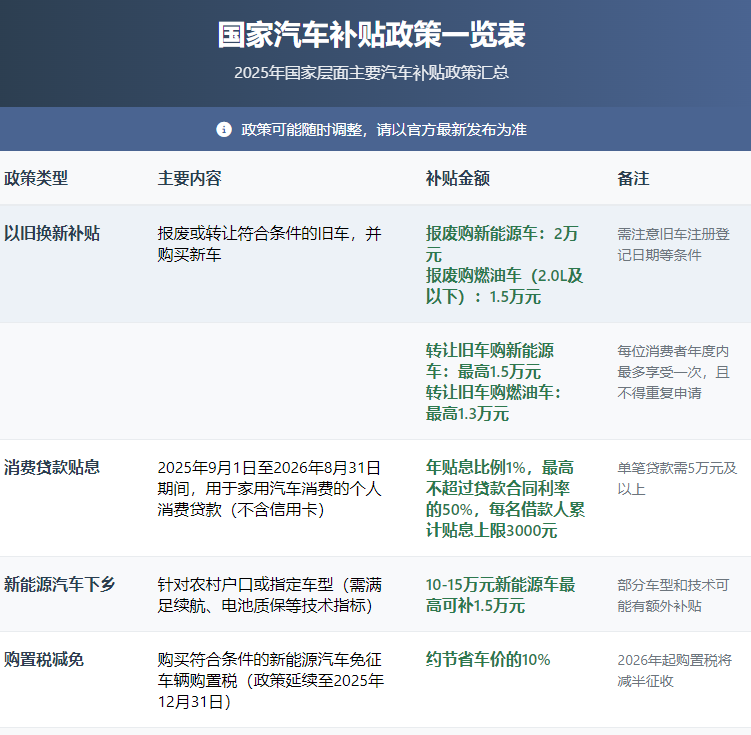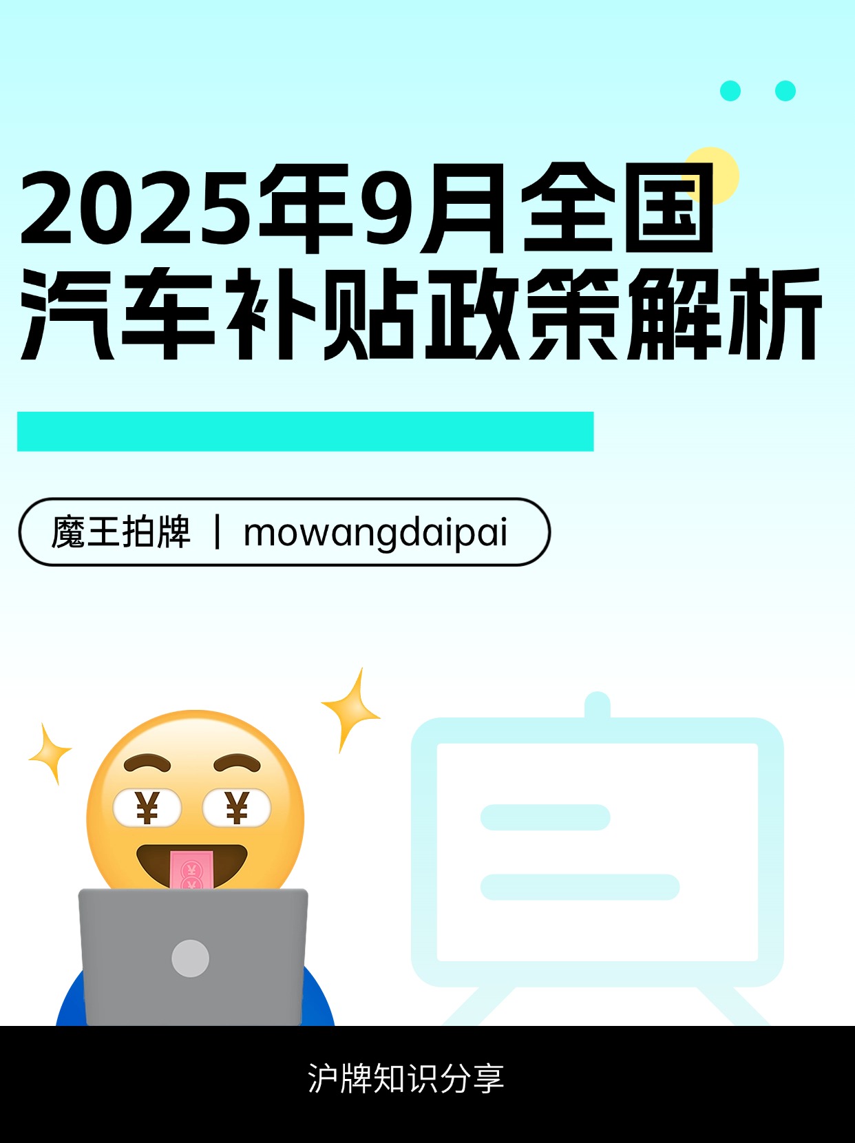 关于2025年9月的全国汽车补贴政策,国家层面和地方都出台了一些措施,旨在降低购车成本,促进汽车消费。下面魔王拍牌将为你梳理主要信息。