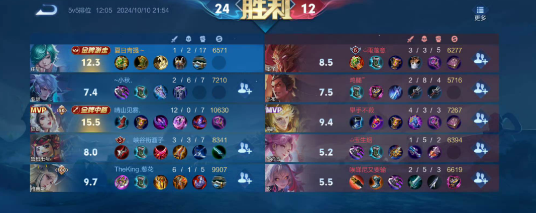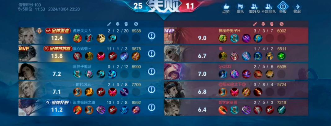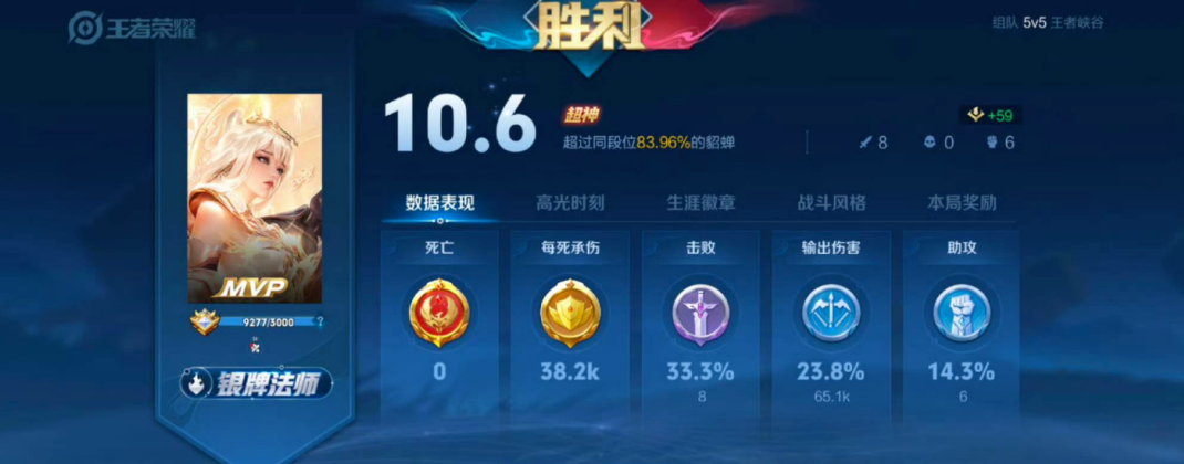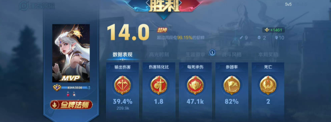 事实上,每位英雄获得金银牌的难易程度不尽相同,就拿吕布这类胜率垫底的英雄来说,可能评分超过9分就可以拿到银牌,超过11分就可以拿到金牌,但是貂蝉却需要14分才能获得金牌称号。当然这还只是对于胜方而言,而败方由于经济、输出都被限制,故而整局概率都会被压制着打,这就导致很难打出超90%玩家的高光操作。也正因如此,玩家们即便获得了败方的MVP,大概率也不会是金牌,除非真的拥有国服技术。