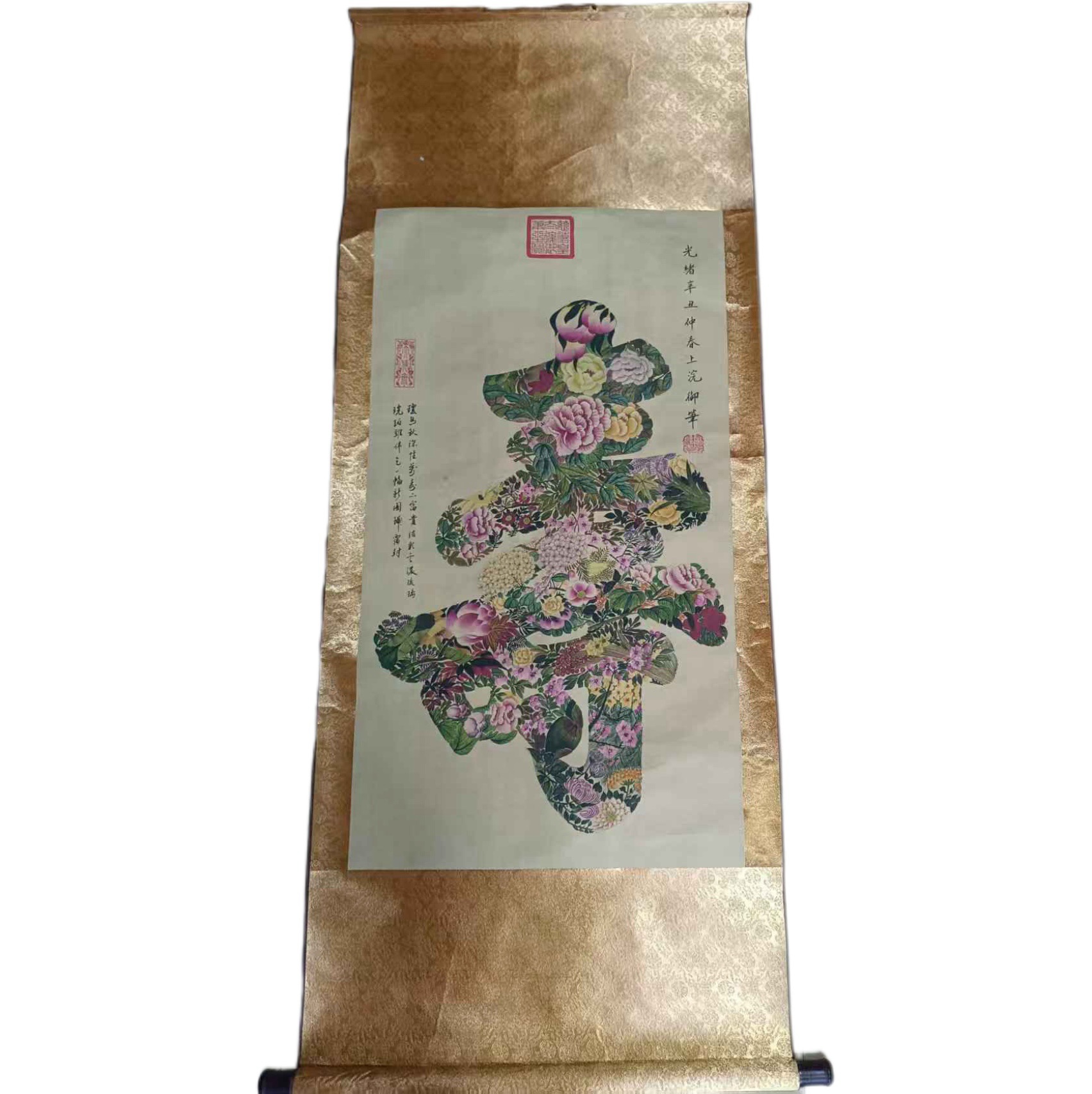 这些花卉并非随意堆砌,而是经过了巧妙的构思与布局。它们的色彩搭配和谐而富有层次,从浓郁的深红、明黄,到淡雅的粉白、浅紫,相互映衬,如同大自然在这 “寿” 字上打翻了调色盘,却又浑然天成。每一朵花的姿态、每一片叶的脉络,都被细致地描绘出来,尽显宫廷画师的精湛技艺。仿佛能看到,在光绪年间的宫廷画室里,画师们屏气凝神,用细腻的笔触,将对生命的敬畏与对美好的向往,一点点融入这 “寿” 字之中。