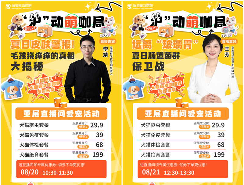 无法亲临现场的宠友亦能云端共享盛会!瑞派宠物医院「美团直播间」已全面开启宠粉通道,于8月20日至23日每日上午10:00-14:00,云端同步放送免疫驱虫、绝育体检超值套餐、品质健康好物甄选及科普知识专享福利。即刻扫码关注预约直播间,开播领券锁定优惠,限量席位,先到先得,让关爱跨越时空限制。