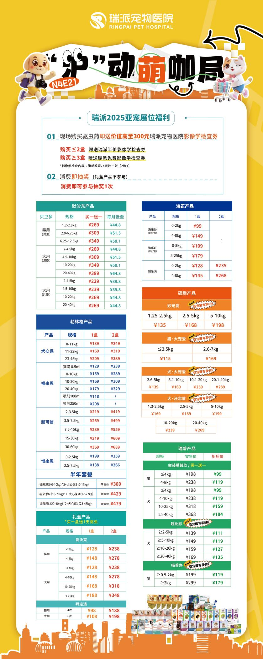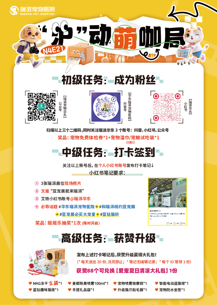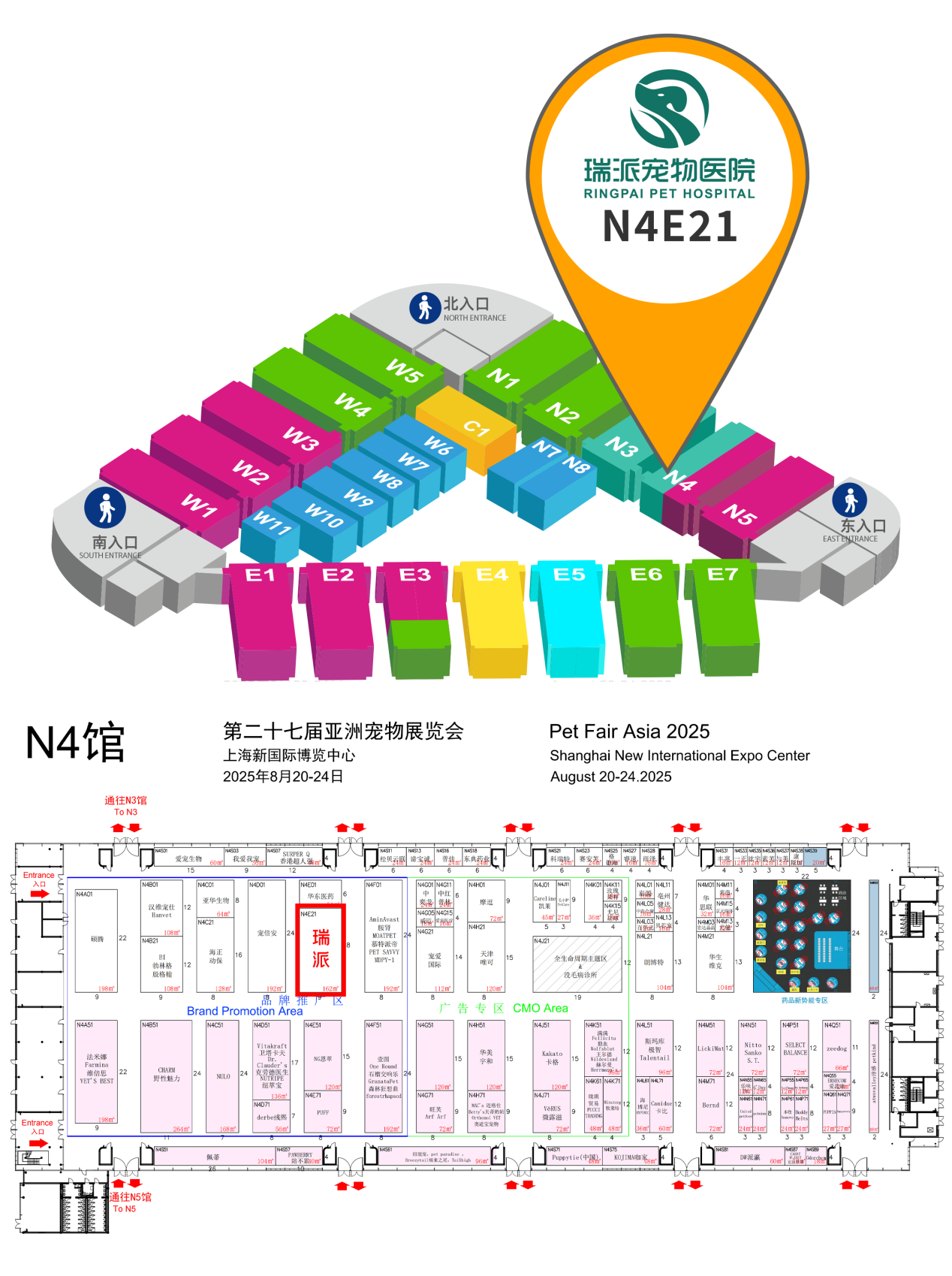 本届展会规模空前,共设17大主题展馆、8大供应链专馆及1个活力户外区。瑞派宠物医院核心展位位于N4馆E21(N4E21),诚邀您亲临这片汇聚前沿科技、专业呵护与无限惊喜的专属空间。