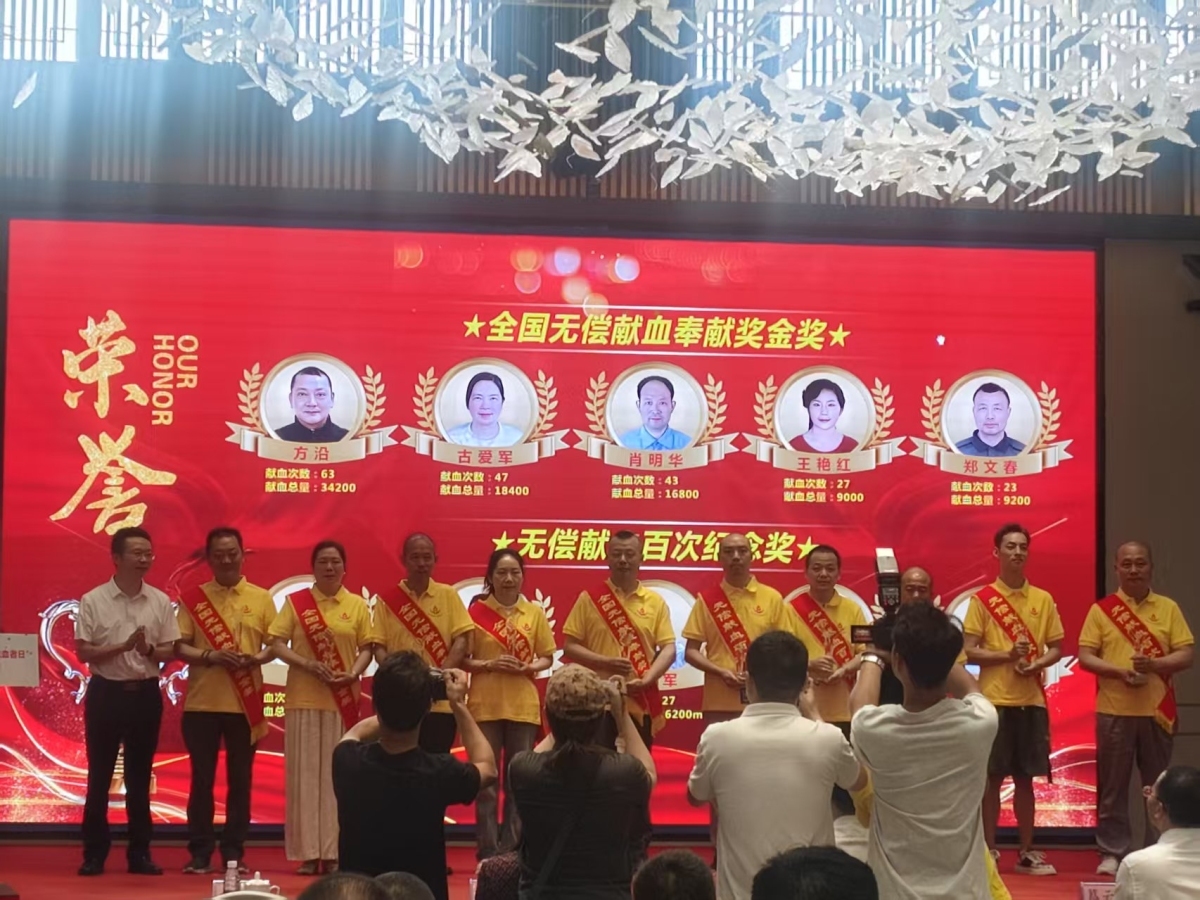 “今天,在这里隆重举行我市2022—2023年度无偿献血表彰活动,谨向广大无偿献血志愿者表示崇高的敬意!向受表彰的无偿献血先进单位和个人表示热烈的祝贺!向长期关心、支持无偿献血公益事业发展的社会各界表示衷心的感谢!向辛勤工作在无偿献血事业第一线的广大采供血工作者表示亲切的慰问!……”副市长高刃致辞:“……二十多年来,我市已形成政府主导、全社会积极参与的无偿献血机制,‘自愿、无偿、利他’的理念正逐步深入市民心中,我市已连续二十四年、十二届荣获‘全国无偿献血先进城市’光荣称号。市红十字会党组书记郑雪梅现场介绍了2022—2023年度我市无偿献血奉献奖终身荣誉奖及“无偿献血奉献奖金奖、 银奖、 铜奖”“无偿献血促进奖” “无偿献血志愿服务奖”……等奖项获奖情况。随后,相关领导为肖明华等无偿献血奉献奖金奖代表、靳小文等无偿献血终身荣誉奖代表、周述军等新增百次献血者代表你颁奖,为卢胜飞、齐红群颁发全国无偿捐献造血干细跑奉献奖,为荆门市红十字中心血站颁发“全国无偿献血促进奖”,为荆楚理工学院、荆门市退休军人事务局授旗……活动大厅,各县(市、区)卫生健康局、红十字会工作负责人,市红十字中心血站负责人,无偿献血志愿者代表及荆楚理工学院、市退休军人事务局志愿者代表济济一堂。荆楚热血志愿服务队召集人钱亚平的带领下,田昌勇、曾林、江仁平、王娟、王卓光……等数十名荆楚热血志愿者身影眼前闪亮。最后,大家兴致勃勃的观看了无偿献血专题片《热血护航 守护生命方舟》。交流中,荆楚热血志愿者纷纷表示:身体力行推广无偿献血,更加积极的融入无偿献血公益事业,让更多市民了解无偿献血、参与无偿献血,号召、引导健康适龄公民积极奉献爱心,用实际行动保障临床用血需求——