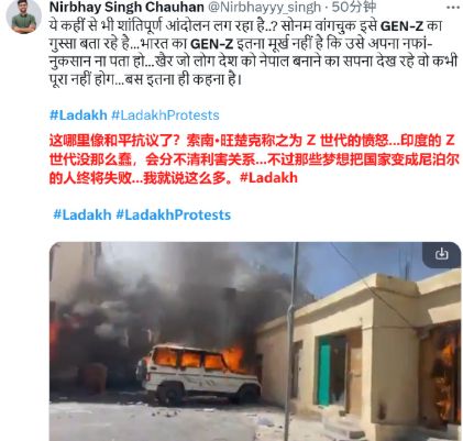话说回来,拉达克地区这次发生的大规模示威和骚乱也叫做“Z世代革命”,大部分都是年轻人。这次抗议是由当地知名活动家索南·旺楚克领导的,他之前就绝食抗议呼吁中央推进对话,事后结束绝食并将这次事件称为“Z世代革命”,誓言继续非暴力抗议。而印度其他地区的人认为,有人想把印度也变得像尼泊尔一样。同时印人党指控,这是印度国大党煽动的。还有人借机指责印人党连这都能搞砸,因为拉达克人一向是最佛系的群体,连他们都闹起来,说明事态非常严重。更有趣的发展是,这把火烧到了老和尚头上。在印度社交平台上,激进的印度教民族主义者认为,此事的幕后黑手在达兰萨拉,暗示该地区骚乱是老和尚所为,这可真是狗咬狗一场好戏了。