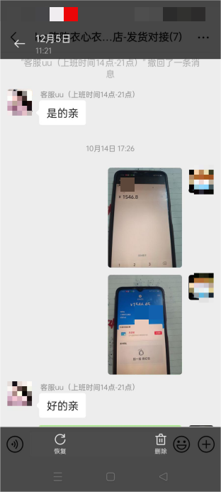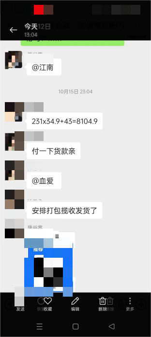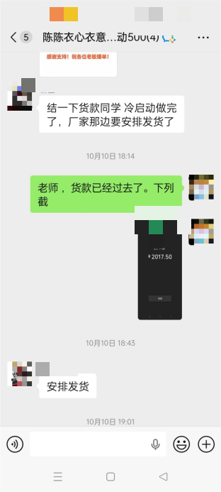 杨女士与厂家为“先付款后发货”合作模式,累计支付4笔货款合计约19844.82元(其中两笔款项直接付给了客服),具体为:10月10日:一笔未明确订单,支付2017.50元;10月14日:U款59件单裤+2件加绒裤,支付1546.45元(应付款1546.8元);10月14日:234单U款加绒裤,应付款8175.6元;10月16日:231单新款刺绣,支付8104.02元(应付款8104.9元)。
