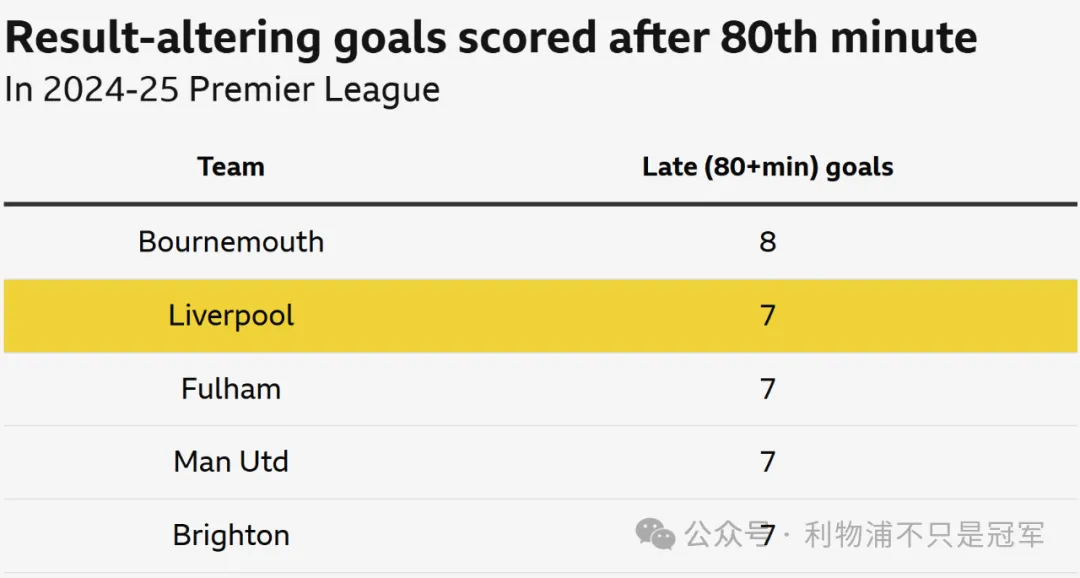 --上赛季利物浦在英超80分钟以后,改变最终比赛结果的进球一共7个,与富勒姆、曼联、布莱顿并列,比伯恩茅斯少一个。