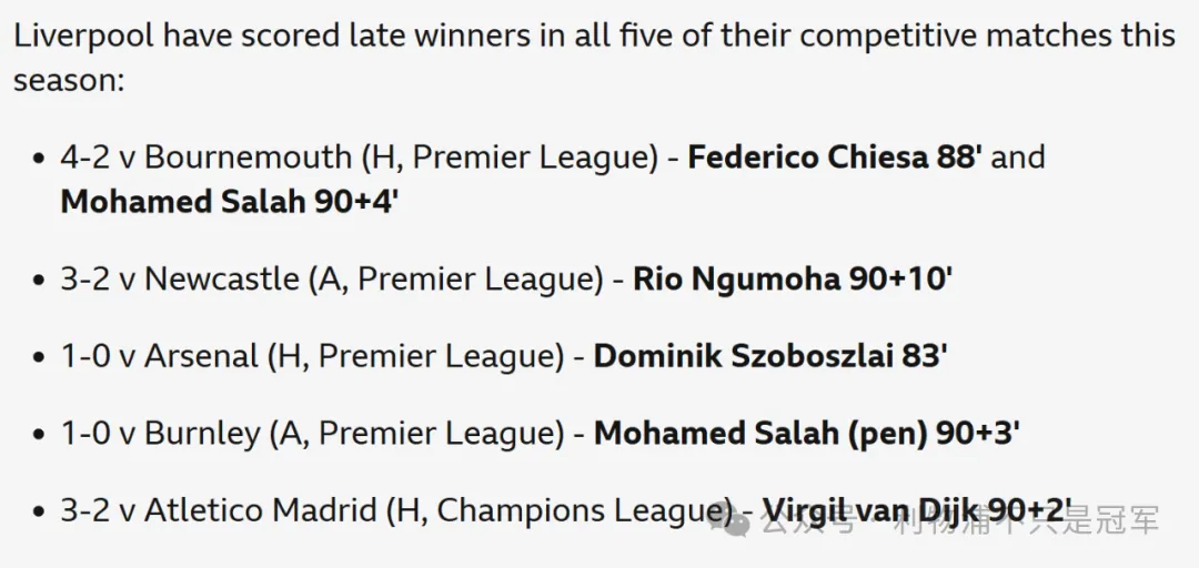 --利物浦本赛季80分钟以后的进球,萨拉赫一共参与3球(2球1助),索博斯洛伊2球(1球1助),基耶萨、恩古莫哈、范迪克和远藤航各1球。