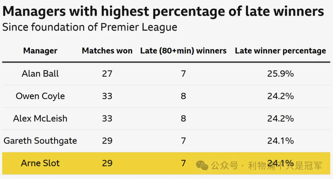 --斯洛特目前在英超一共拿到29场胜利,其中有7场是80分钟以后绝杀,占比24.1%,在所有至少拿到25胜的英超主帅中,这个比例可以排名第5。