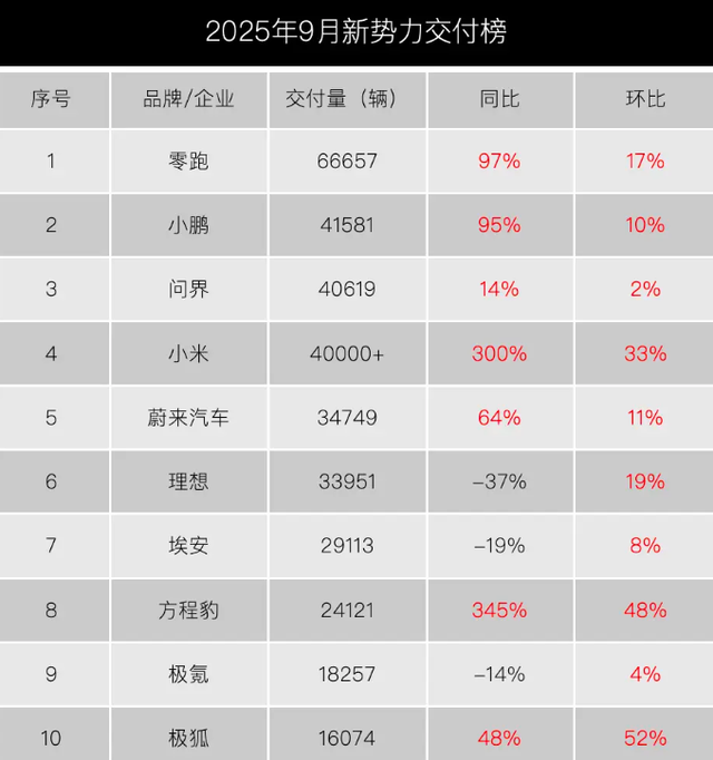 “金九银十”诚不欺我,各家销量创新高之际,小米汽车更是迎来大爆发,超4万台的交付量让它首次跻身前四,将理想和蔚来甩在身后,33%的环比增长说明产能终于跟上了节奏。