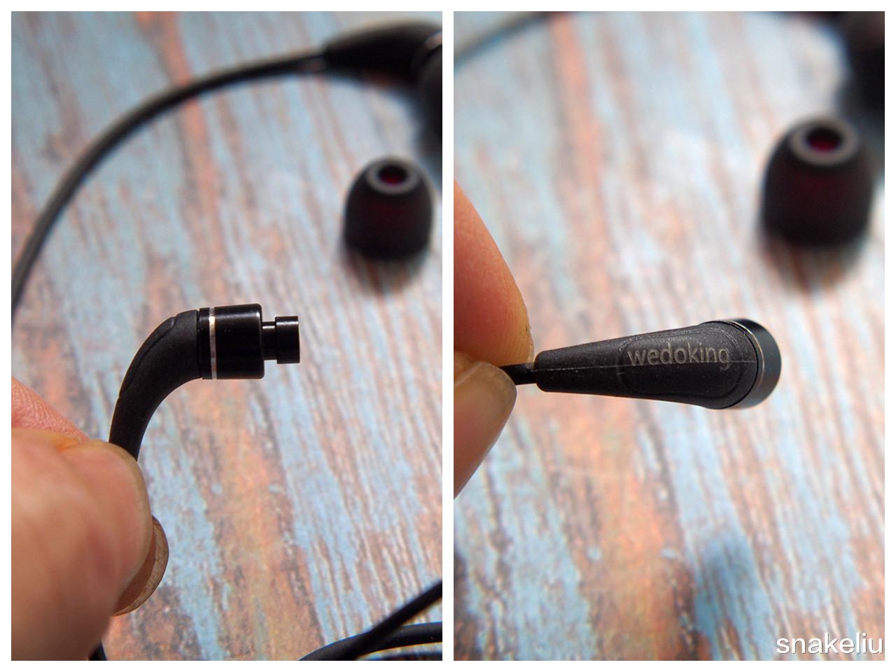 去除耳帽可以很清楚的看到,耳机的整体设计非常紧凑小巧,背面依然可以看到wedoking的logo,可以看出厂家的细致做工不亚于千元级别的耳机。这种小耳塞配合不同的耳帽可以达到不同隔音效果,一般的硅胶耳帽可以达到20dB降噪效果,而慢回弹耳帽可以达到33dB降噪效果,还是比较可观的。