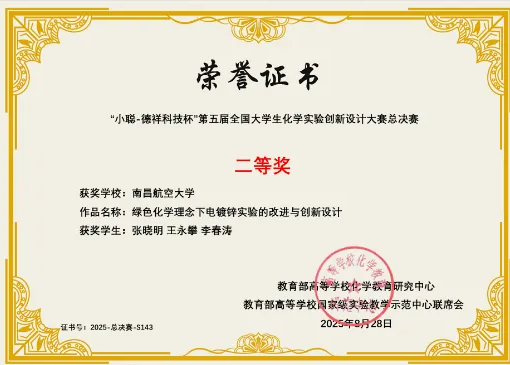 在第五届全国大学生化学实验创新设计大赛上,环境与化学工程学院的团队没有局限于传统实验方案,而是将绿色化学理念与工业需求结合,研发出《绿色化学理念下电镀锌实验的改进与创新设计》—— 这套方案不仅解决了传统工艺的污染问题,更在华中赛区斩获一等奖后,一路冲进全国总决赛拿下二等奖,让课堂上的理论知识变成了能落地的技术方案。