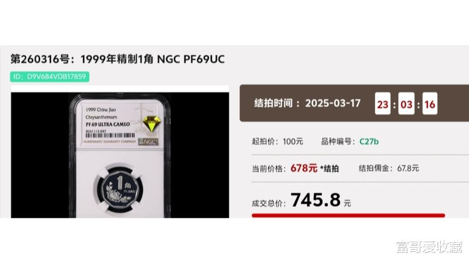 上面这枚1999年的精制“菊花1角”,NGC评级69分,在今年3月份的拍卖中,最后拍出了745.8元。
