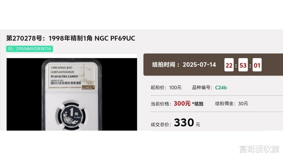 上面这枚1998年的精制“菊花1角”,它的NGC评级分数为“69分”,在今年7月份的拍卖中,最后拍出了330元。