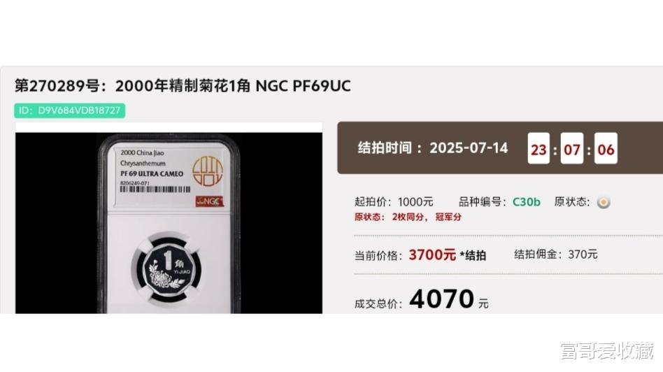 上面这枚2000年的精制“菊花1角”,NGC评级也是在69分,在今年7月份的拍卖中,就拍出了4070元。