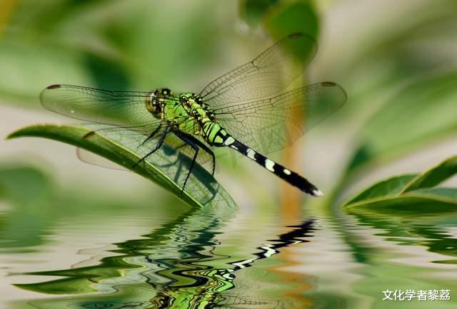 我轻轻振动了一下,那对薄至通透的长翼,身躯便离开了承载我一夜清梦的苇杆。空气于我,不是虚空,是漾着波纹的、有弹性的水,我只需用翼梢轻轻一拨,便悠然前行。风,是我身体的一部分。当碧蓝色的翅膀挟着营营的响声刮起微型旋风,我的形体在迅速运动中变得像是罩上一层薄纱,若隐若现,难以捉摸。我知道,在你们人类浩如烟海的典籍和口耳相传的神话里,我有着更多的名字。“蜻蜓”这个称谓,于我,既确切,又陌生。确切的是这具身体,这对薄若轻纱的翅膀,这身釉彩斑斓的长袍;陌生的,是你们附加于我之上的所有梦想与惆怅。