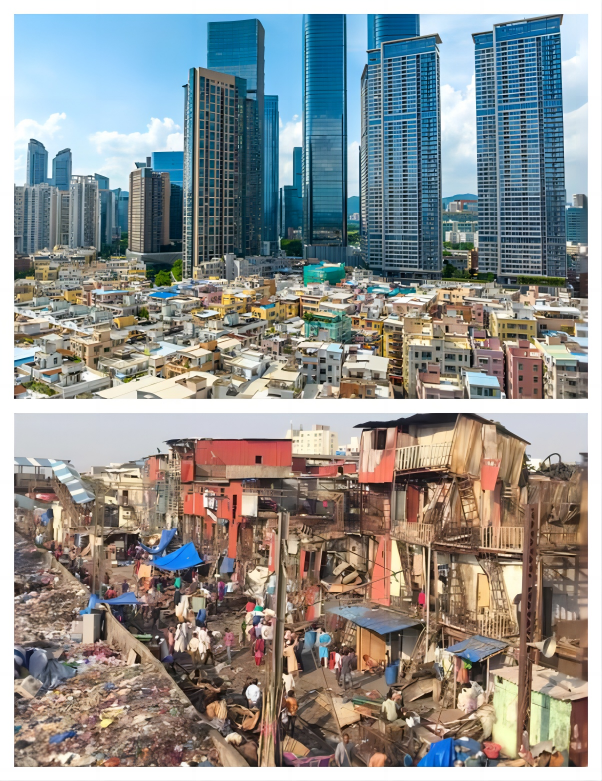 他把中国所谓的“贫民窟”(实际为城中村)和孟买贫民窟的照片放一起对比:一个整洁设施齐全,一个是则是真脏乱差。