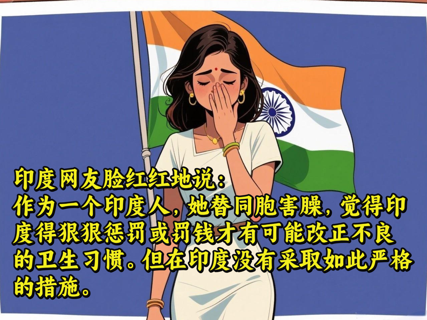 作为一个印度人,她替同胞害臊,觉得印度得狠狠惩罚或罚钱才有可能改正不良的卫生习惯。但在印度没有采取如此严格的措施。