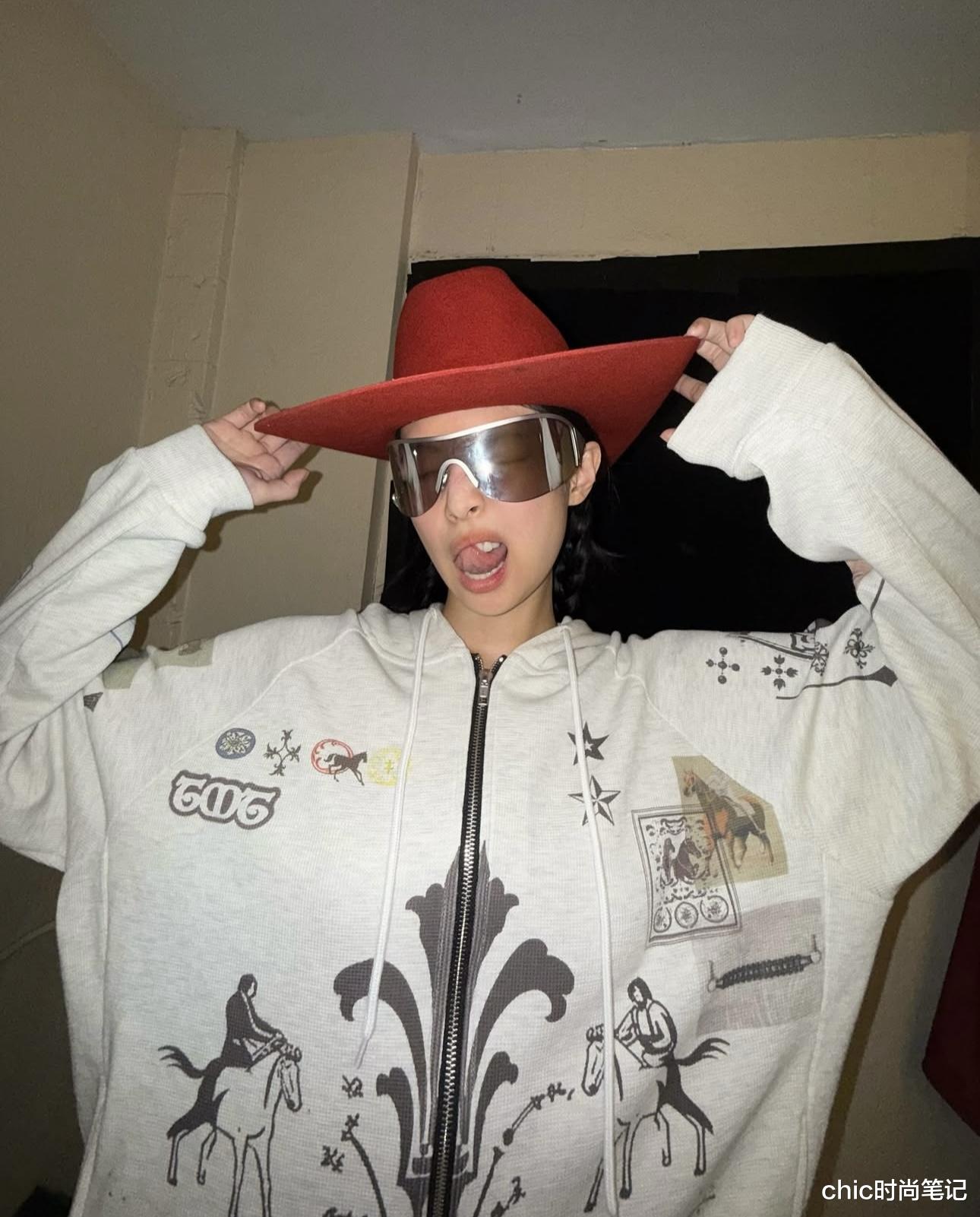 oversize版型的卫衣外套很有街头嘻哈气息,卡通抽象的图案充满创意和艺术魅力,配上牛仔帽子和朋克风墨镜,奶凶奶凶的Jennie!