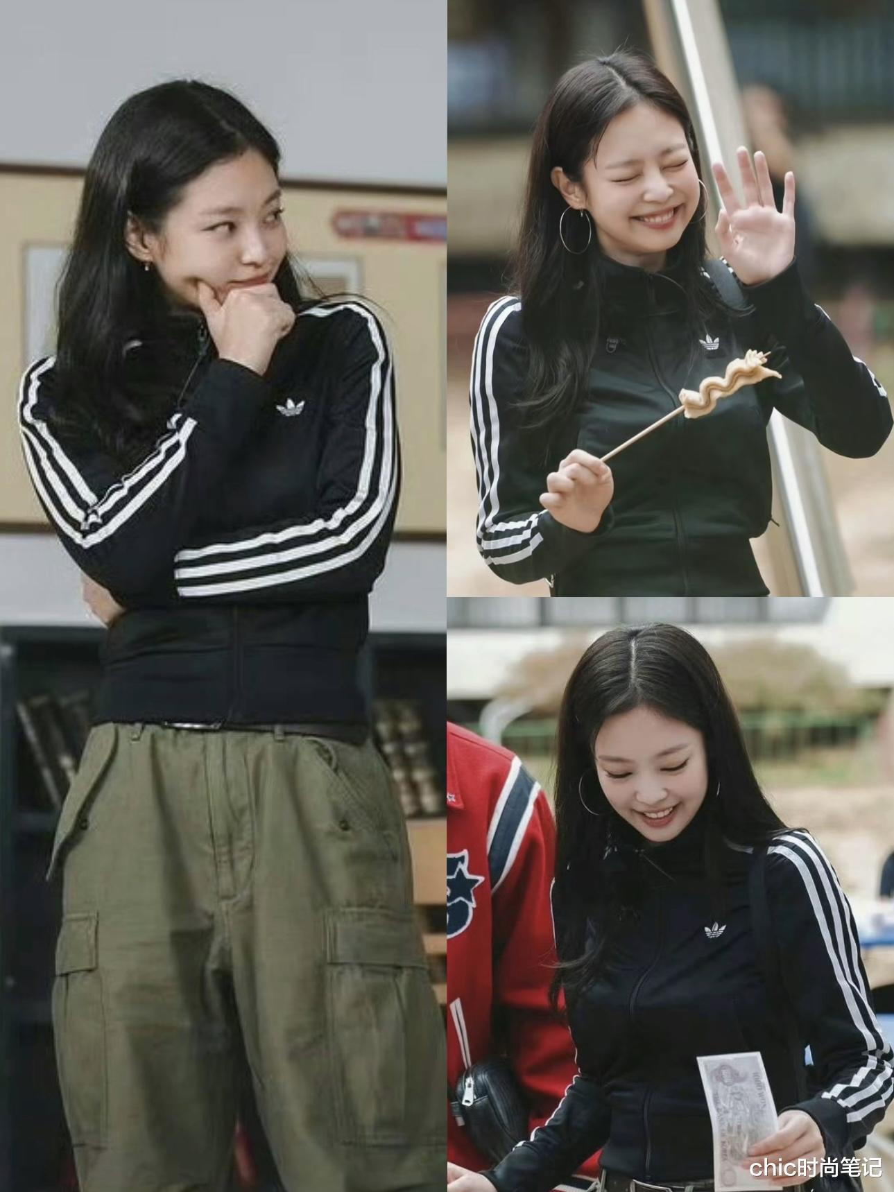 黑白运动上衣+军绿色工装长裤,简简单单的基础款穿搭也能让Jennie穿出时尚。