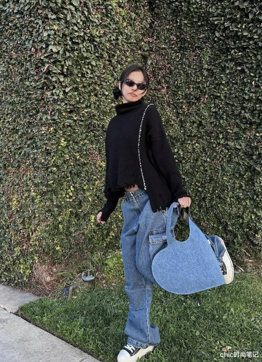 这件黑色毛衣最有特色的点就是破洞流苏款下摆,不规则的下摆很有设计感,搭配宽松直筒的牛仔裤,整体风格chic感十足,活脱脱就是一只俏皮小猫。