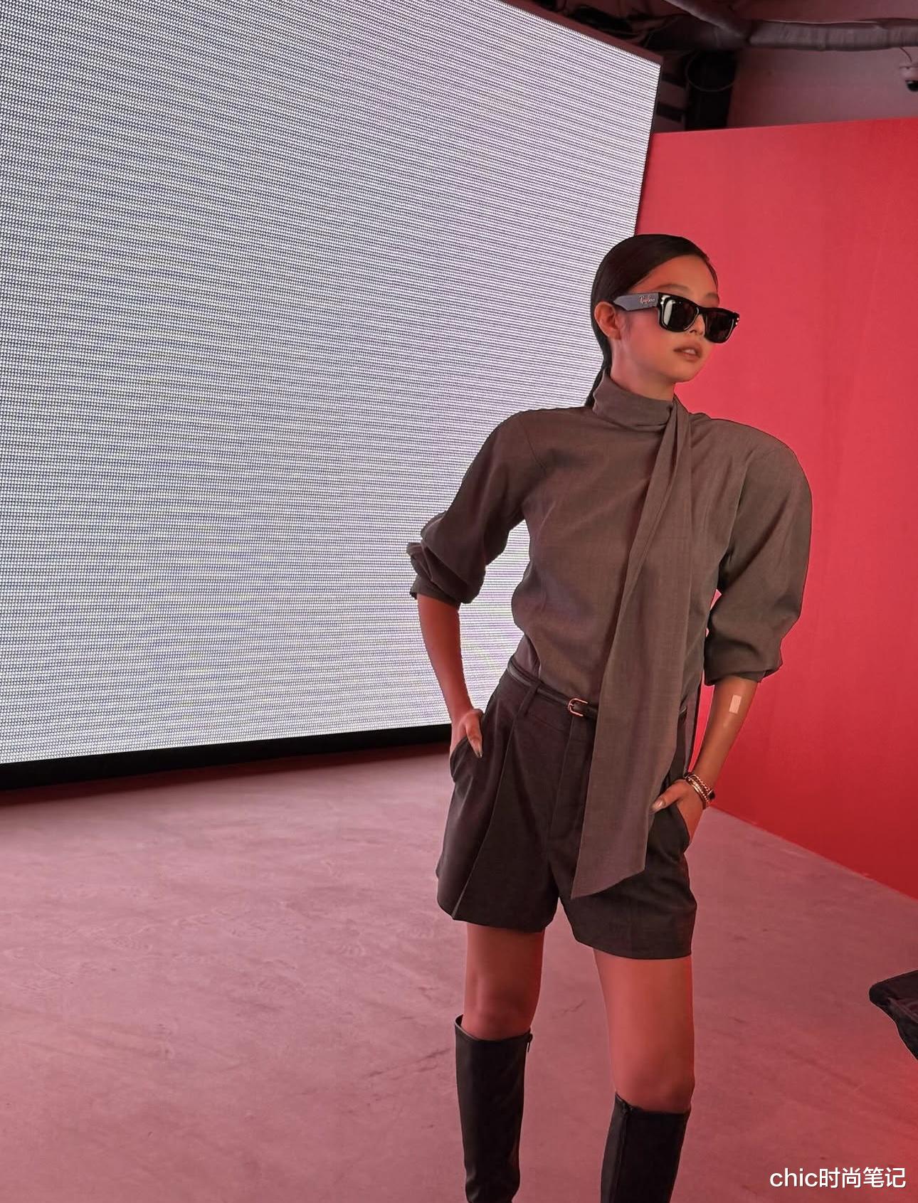 灰色衬衫是领口的长款飘带非常有设计感,很像一条休闲的围巾,把原本简约基础的立领衬衫变得细节起来。下身搭配的同色系灰色西装短裤和高筒靴子,又酷又奶。