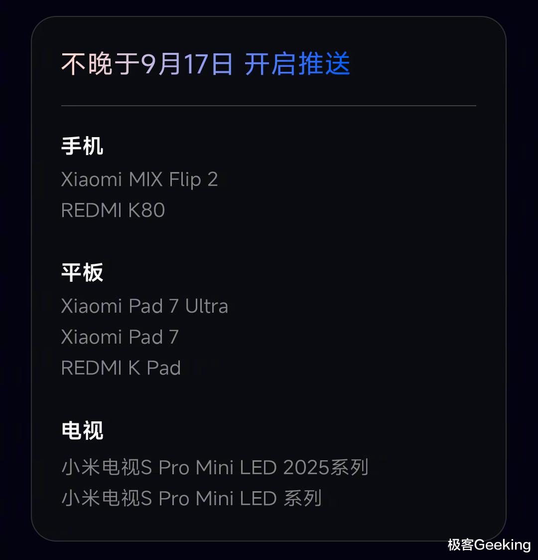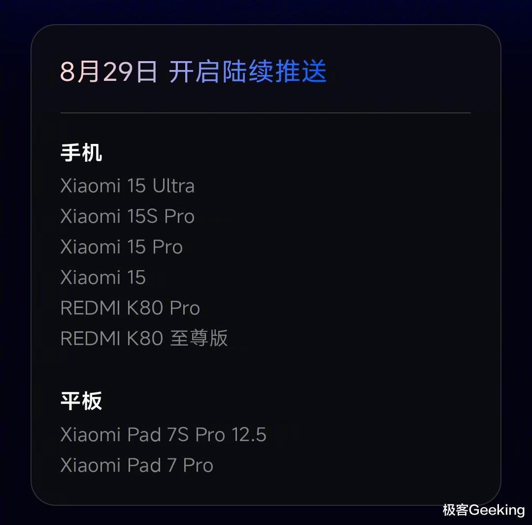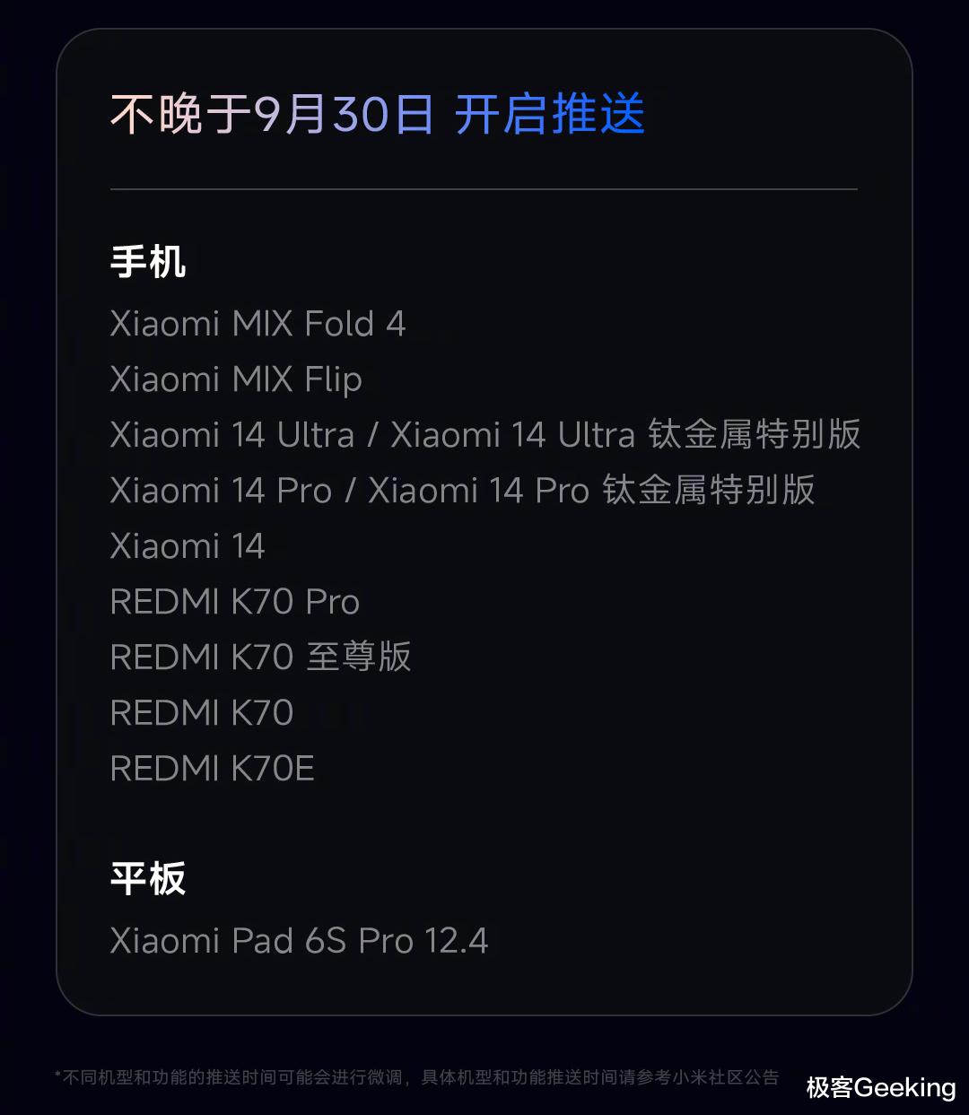 首先来看看大家最关心的支持机型名单和升级计划,最快明天第一批开启升级推送,届时极客君还会带来相关内容的文章发布,第二批是会在 9 月中旬推送,第三批则是 9 月底前推送,分三批逐步覆盖近两年的小米和红米旗舰机型,完整机型名单如下: