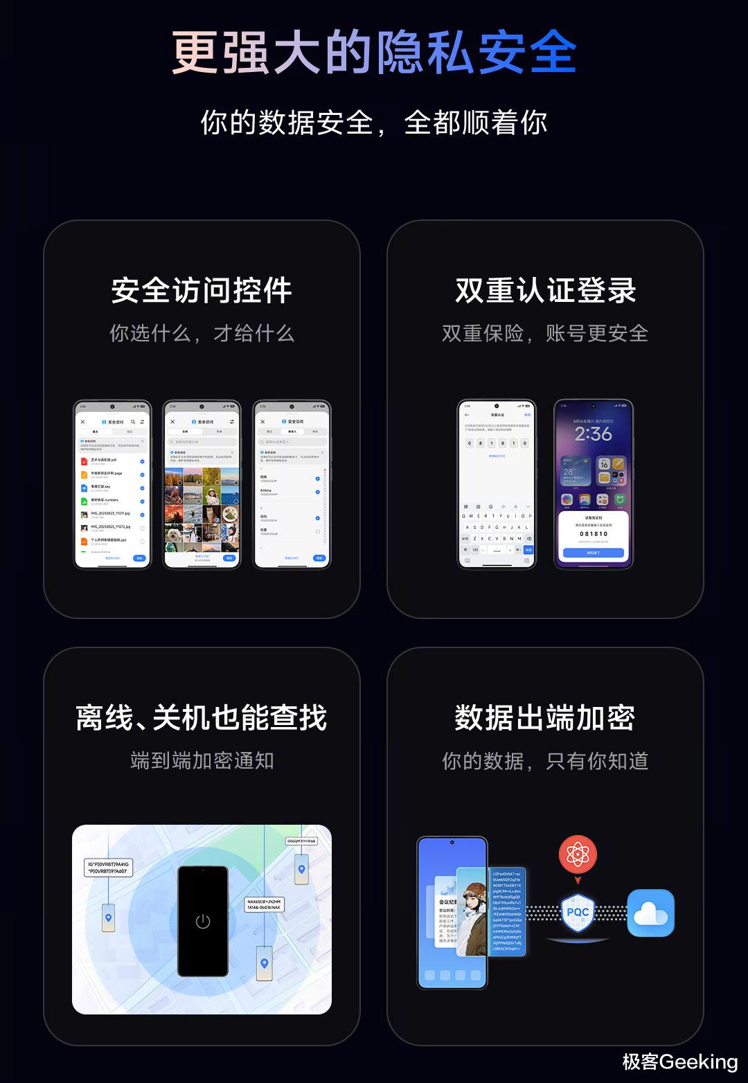 小米澎湃OS 3 隐私安全再升级,新增支持双重认证登录、高级数据保护、设备查找支持手机关机/离线也能找、全新安全访问控件的功能特性。