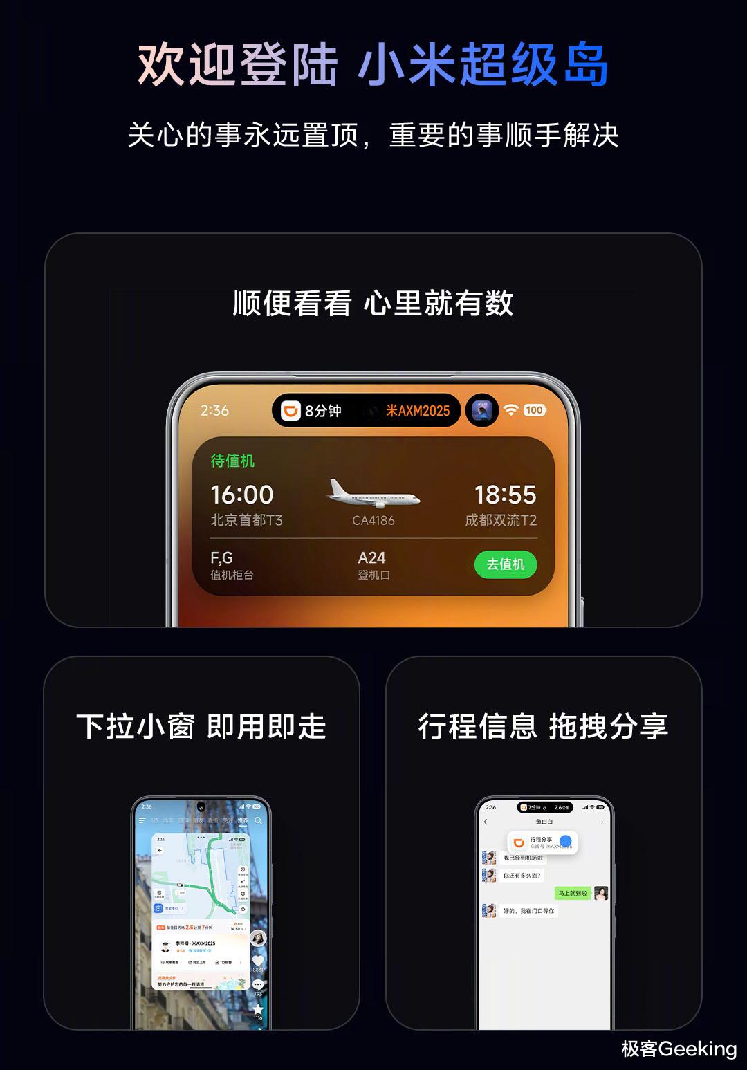 主打不遮挡状态栏,重要信息一目了然,支持三岛共存、下拉小窗即用即走、行程信息也能拖拽顺手分享。