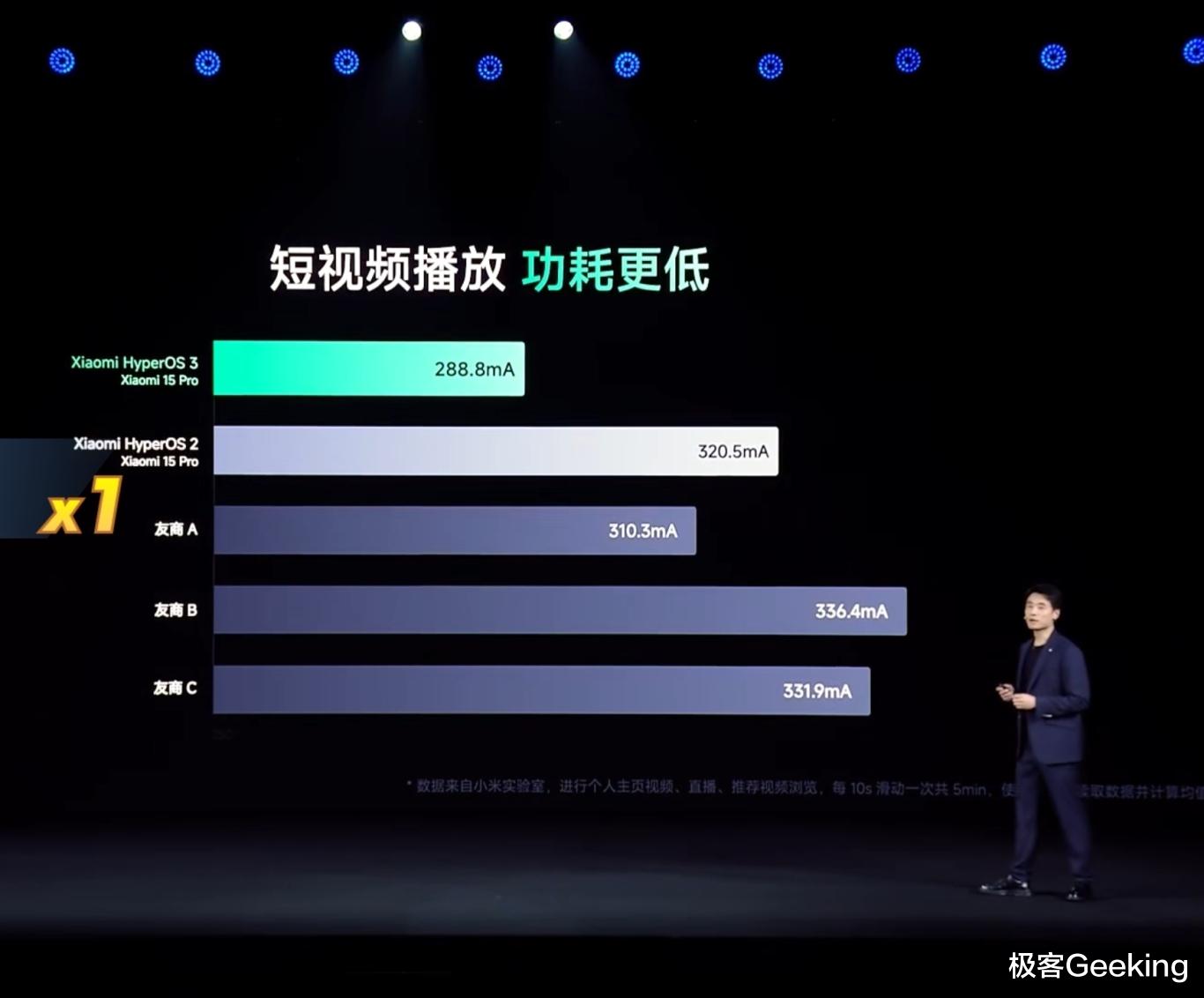 在短视频播放场景官方公布数据,小米澎湃OS 3 的系统功耗较上一代的澎湃OS 2 大幅降低,而且明显低于友商手机系统。