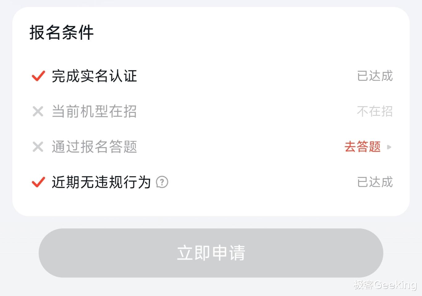 这里有版本介绍、招募机型、内测须知和报名条件等内容,划到页面最下方可以看到报名条件有 4 项,分别是: