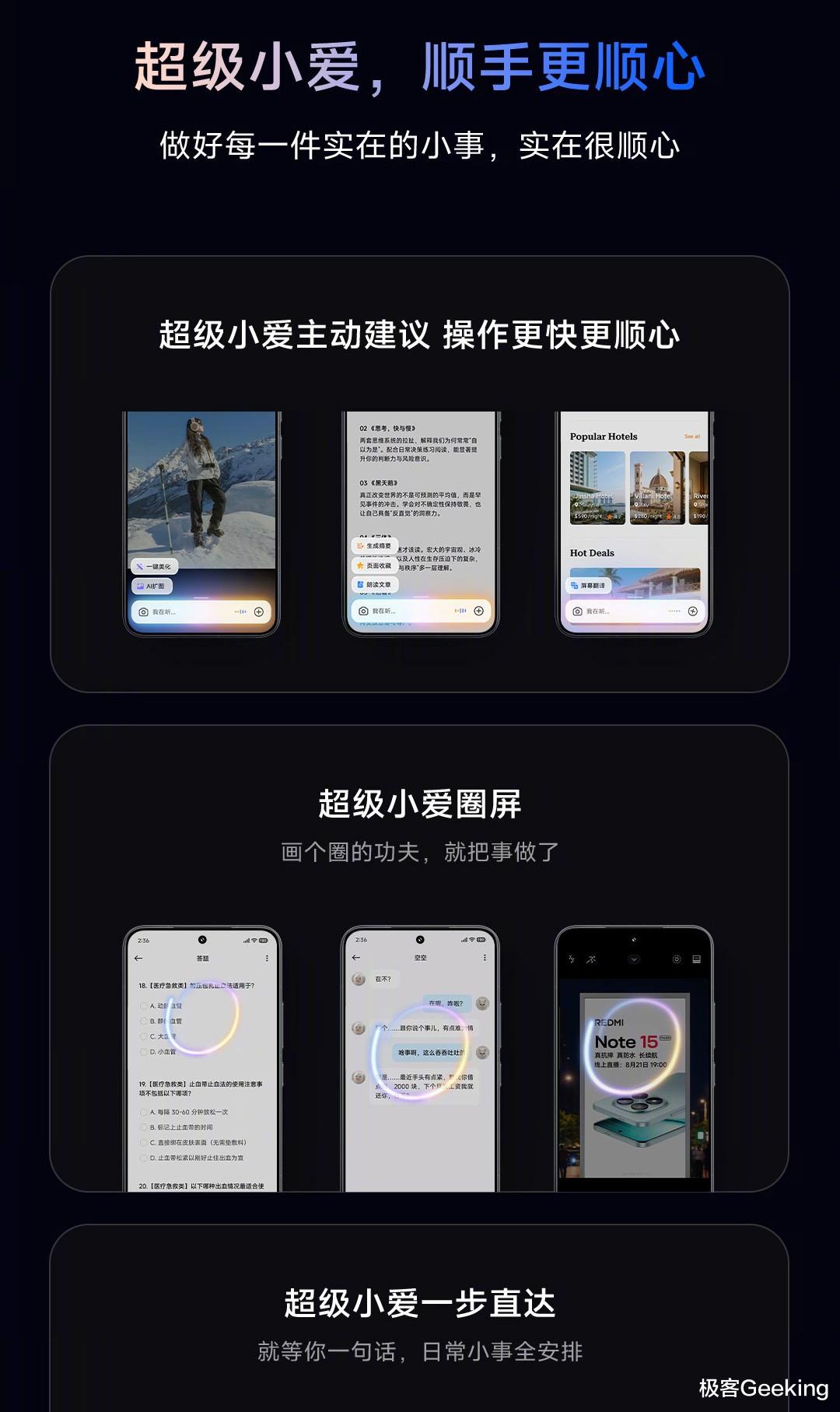 小爱同学再进化,新增支持主动推荐超级小爱建议、圈屏以及一步直达功能。
